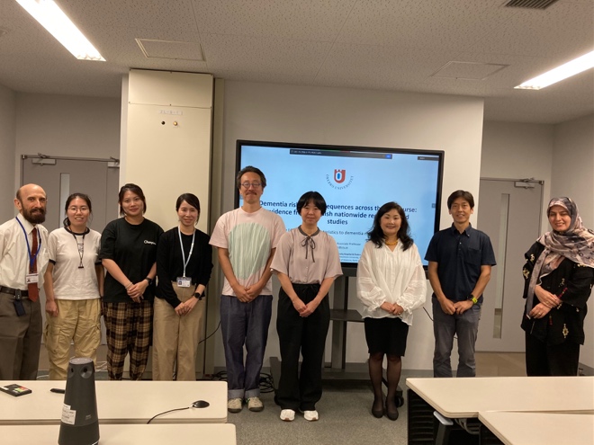 2025年10月7日午後、京都大学大学院医学研究科社会健康医学系専攻(KUSPH)にて、「スウェーデン全国レジストリベース研究から得られたライフコース全体における認知症リスクとその結果について – ライフコースの特徴と認知症リスクおよび結果の関連: 思春期から高齢期まで」のタイトルで国際レクチャーが開催されました。現地とZoomを用いたハイブリッド形式で、約20名の学生および教員が参加しました。本講演では、スウェーデン・オレブロ大学の日吉綾子准教授をお招きし、スウェーデンにおける認知症リスクとその結果をライフコースの視点からご紹介いただくことを目的にご講演いただきました。